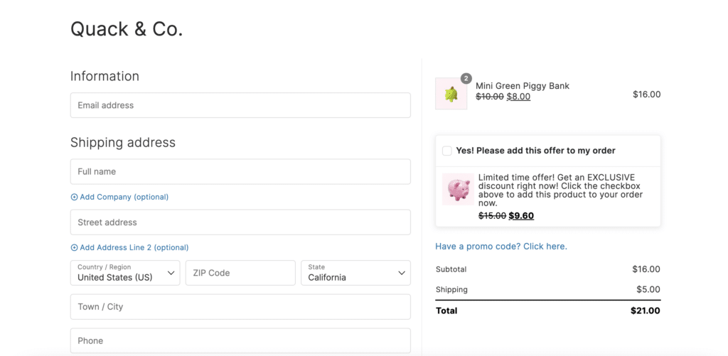 7. After saving your changes, navigate to your store’s checkout page to preview your newly created order bump. Here’s an example: