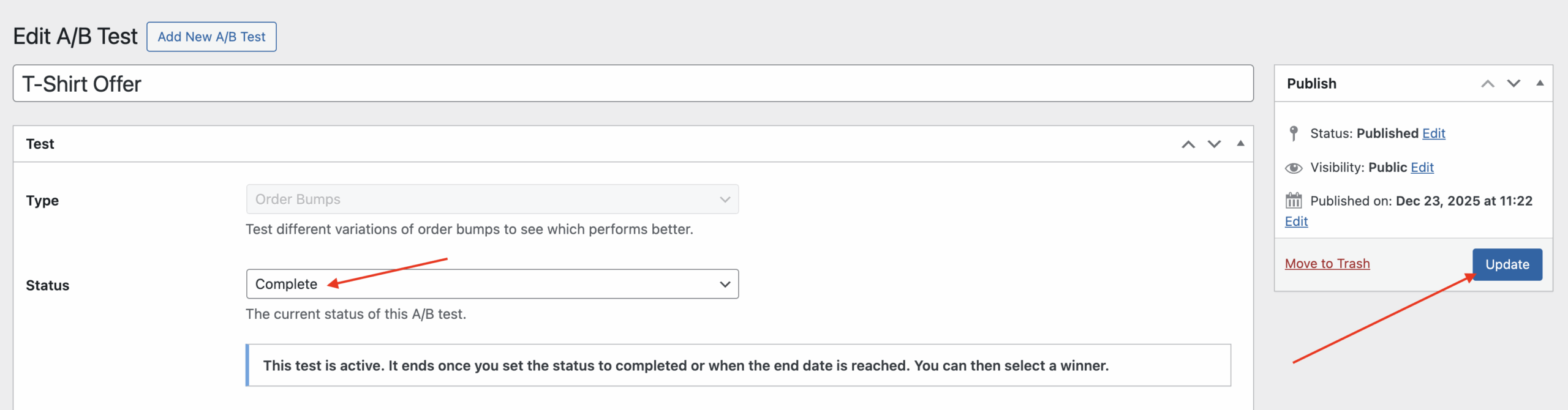 - End Date (optional): Set when the test should automatically end. After this date, the test status will change to “Complete” and the original order bump will be displayed.